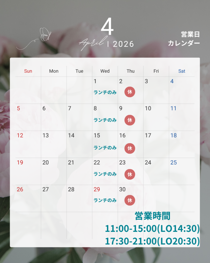 | 営業時間 | 11:00~15:00(LO14:30) 17:30~21:00(LO20:30) ※水曜日は昼営業のみ |